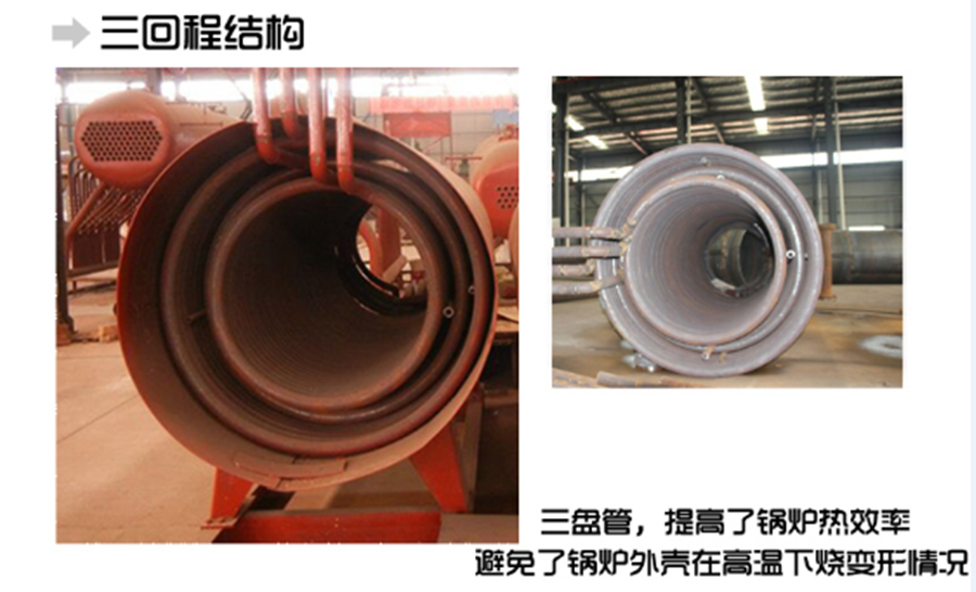 5、大直徑燃燒室:鍋爐燃燒室由大直徑盤管組成,燃料燃燒空間足,燃燒**,熱效 率高。